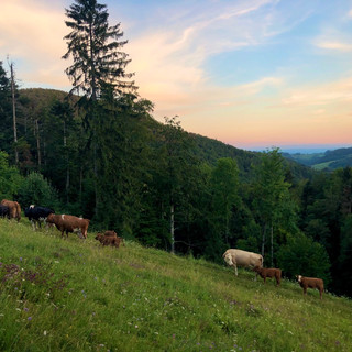 Zweimal im Jahr wird geschlachtet. Die Rinder kommen als Kälber, draussen auf der Weide, inmitten ihrer Herde, zur Welt. Die Herde besteht aus 18 Mutterkühen und ihren Kälbern, welche alle gemeinsam in der Natur leben. Die Kälber wahsen somit mit vielen anderen, gleichaltrigen Kälbern auf. Erst kurz bevor die Wintermonate anbrechen zieht die gesamte Kuhherde mit all den Jungtieren in das Winterquartier namens "Stall". Es handelt sich um einen Freilaufstall, wo die Tiere weiterhin auch jederzeit nach draussen an die frische Luft können und Platz haben, um im frischen Stroh herumzutollen.